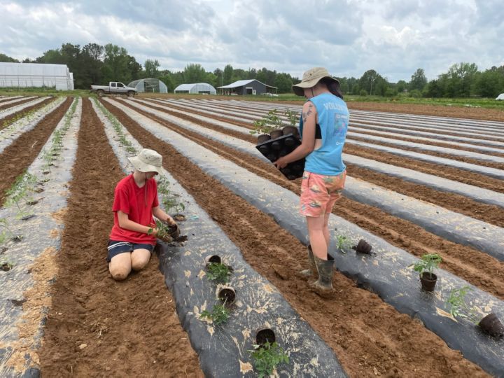 Skylar (L) and Melea (R) planting tomatoes in the field
