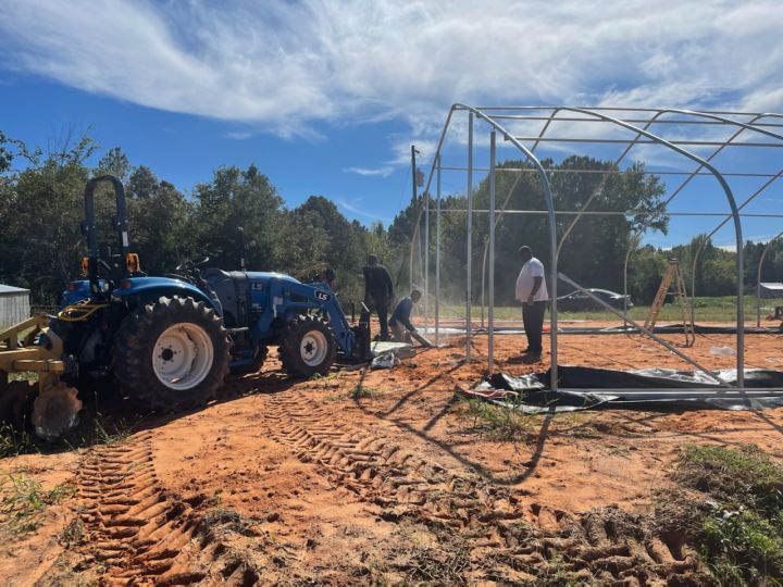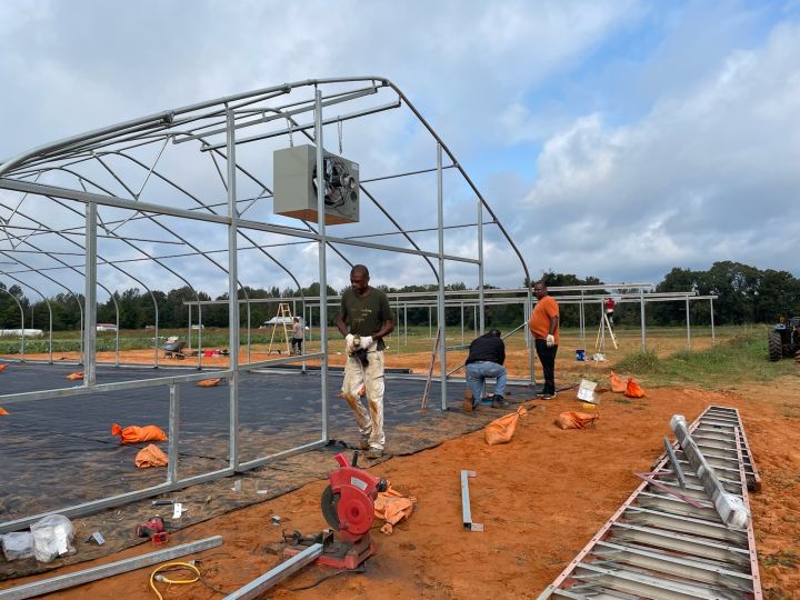 Our greenhouse has heat! Here is Mark and crew instaling the metal end wall supports