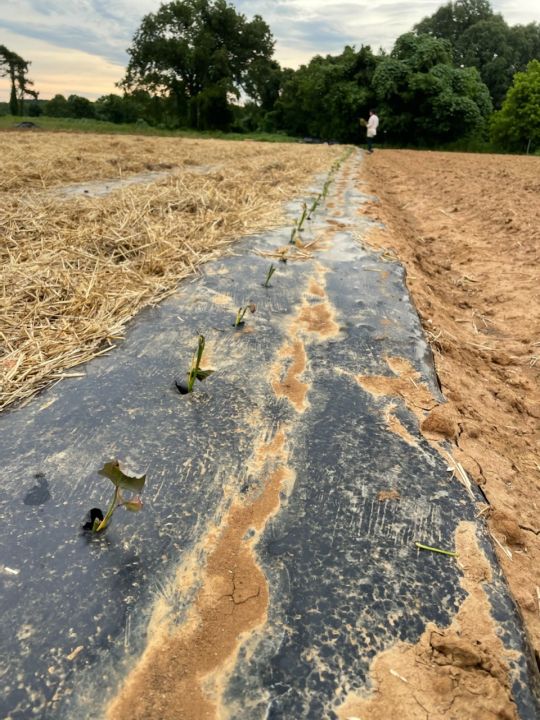 Trying out teff grass as a living mulch, traditional wheat straw mulch on the right