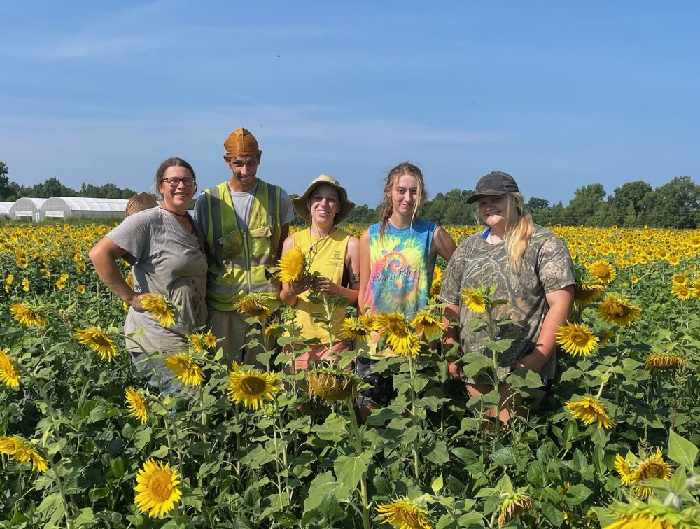 Work crew standing in the sunflowers (L to R) Josephine, robin, Melea, Skylar and Emery